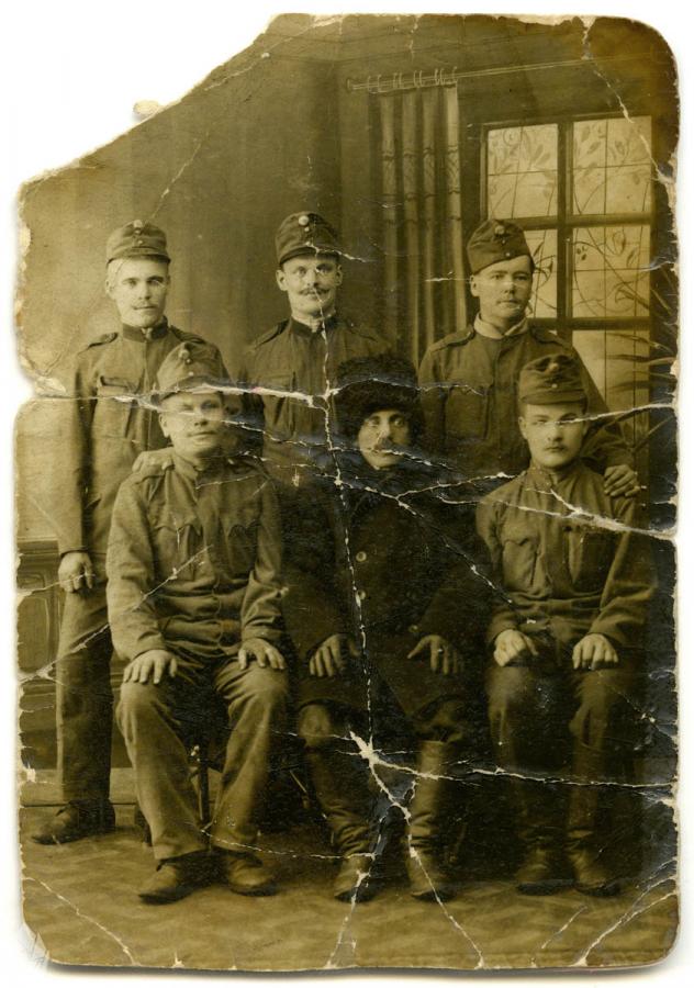Wśród nich pierwszy z lewej siedzi Władysław Łapczyński. Uciekł z niewoli i zmarł na tyfus kilka dni po powrocie do domu.